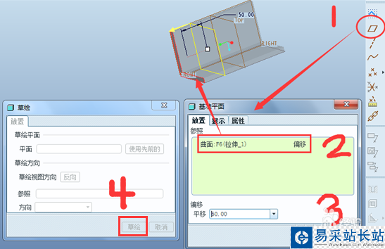 4、系統(tǒng)彈出如下圖左半部分的“草繪”對話框,此時點擊工具欄的“基準面”按鈕(step1),彈出如下圖右半部分的“基準平面”對話框,“參照”處選取L形實體的左端面(step2),偏移距離輸入50,點擊“確定”(step3),形成一個臨時基準面,然后點擊“草繪”(step4)。