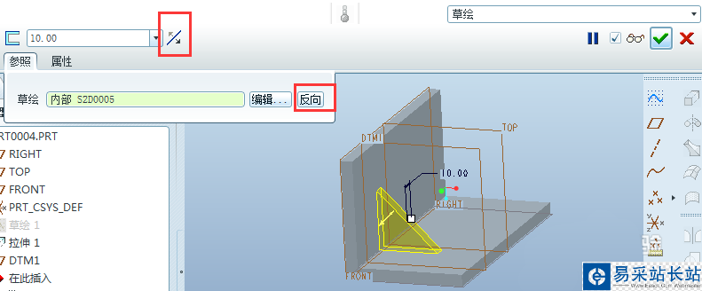 6、此時回到“筋”的控制面板,將默認厚度改為10,調(diào)整筋的方向和草繪方向,預覽效果如下。