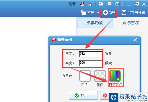 1、打開美圖秀秀軟件,新建畫布設置寬度952x高度200的像素,點擊自定義顔色。