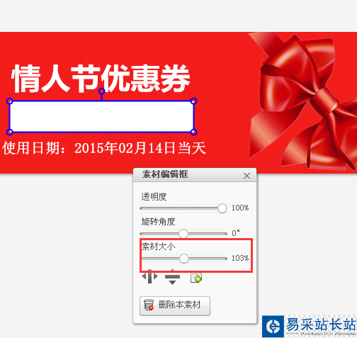 5、調整紅色蝴蝶結圖片的角度,放置于紅色背景上方的最右側顯示,調整好角度后確定即可。