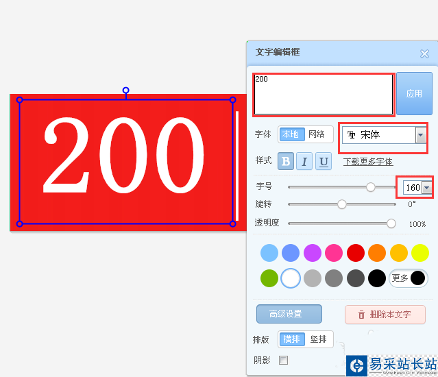 11、在文字編輯框里輸入數字200,設置字體宋體,字號160號,置放于背景的最左側顯示即可。