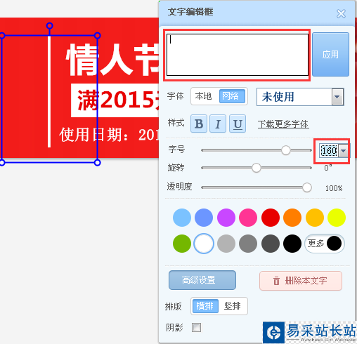 7、在文字編輯框里輸入情人節優惠券文字,設置字體微軟雅黑,加粗,字號41號。同時輸入其他相關的文字,分別輸入三次,字體大小和第一排的文字對齊即可。