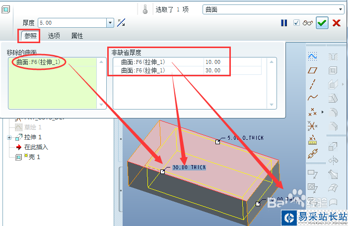 5、除了上述封閉等厚抽殼外,也可創(chuàng)建不同壁厚開(kāi)口殼特征。方法為:右鍵單擊上述殼特征,或者右鍵點(diǎn)擊模型樹(shù)的“殼”,彈出列表中選擇“編輯定義”,進(jìn)入“殼”的控制面板如下。“移除的曲面”選擇上表面,“非缺省厚度”拾取左面和右面,厚度定義為30和10,按√完成。