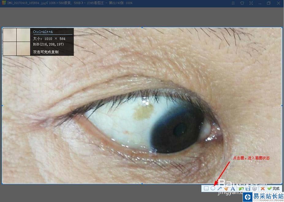 6、再按下圖依次點擊工具條中的圈狀圖形,再選擇圈的線條顏色和線條粗細。選好后就在目標點拖動鼠標圈取目標。如果沒達到預期效果,可以點擊工具條取消,重來的。直到完美。