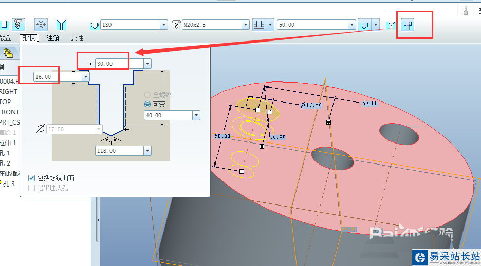 1、新建孔特征,系統(tǒng)彈出如下圖所示“孔”的操控面板,選取“創(chuàng)建標準孔”按鈕(下圖中左上角小方框內(nèi)),放置處選取上表面,偏移參照選取兩個基準面且偏移距離都為50,定義好孔M30x2和孔深80。