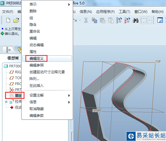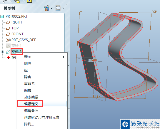 7、修改拉伸。在模型樹中的“拉伸1”單擊右鍵,彈出框中選擇“編輯定義”,即可進入拉伸的編輯界面,對拉伸進行修改。