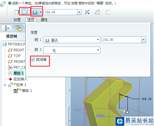 3、拉伸成封閉曲面。選擇“拉伸為曲面”按鈕,下圖第一個紅色框;拉伸方式選擇第一項“從草繪平面以指定的深度值拉伸”,下圖第二個紅色框;選項中勾選“封閉端” ,下圖第三個紅色框。深度值根據(jù)需要輸入即可。
