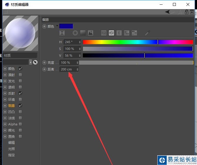 6、距離這個(gè)屬性需要好好修改,否則會(huì)出現(xiàn)渲染后看不到煙霧色,原因可能是,距離數(shù)值太大,適當(dāng)?shù)氖諗恳稽c(diǎn);