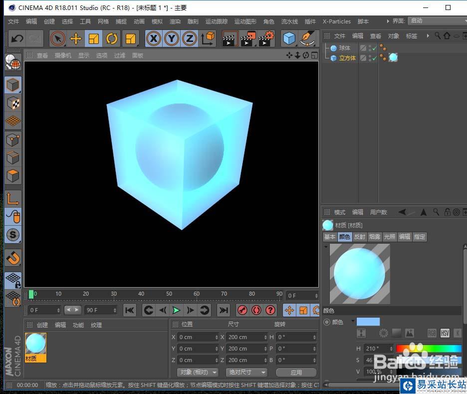 7、新建兩個(gè)對象,正方體包裹著球體,將材質(zhì)球給正方體,渲染后可看出兩種顏色,并能看到中間的球體,如圖所示;