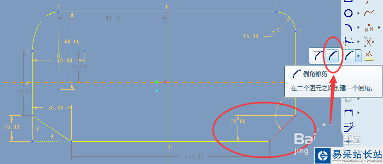 5、倒角修剪。倒角修剪的操作方法如下圖,尺寸僅供參考,其與第4步的區別在于倒角后不保留構造線。