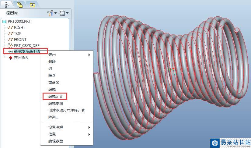 9、點(diǎn)擊“伸出項(xiàng):螺旋掃描”對話框的“確定”按鈕,生成如下的等距螺旋掃描實(shí)體。若要修改該螺旋掃描特征,只需右鍵點(diǎn)擊模型樹的“伸出項(xiàng)”,彈出框選擇“編輯定義”,即可進(jìn)入“伸出項(xiàng):螺旋掃描”對話框,修改相應(yīng)項(xiàng)即可。