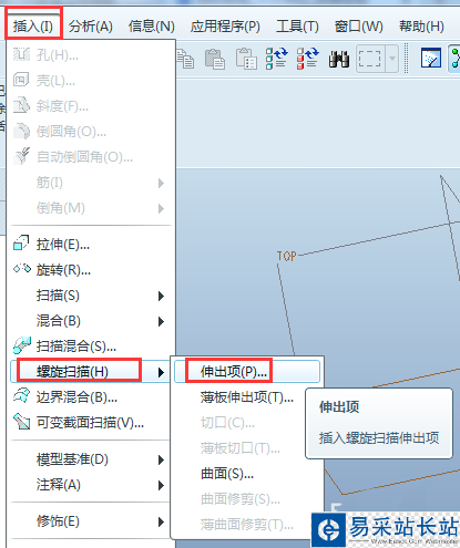 1、新建零件,然后依次點(diǎn)擊“插入”-“螺旋掃描”-“伸出項(xiàng)”。