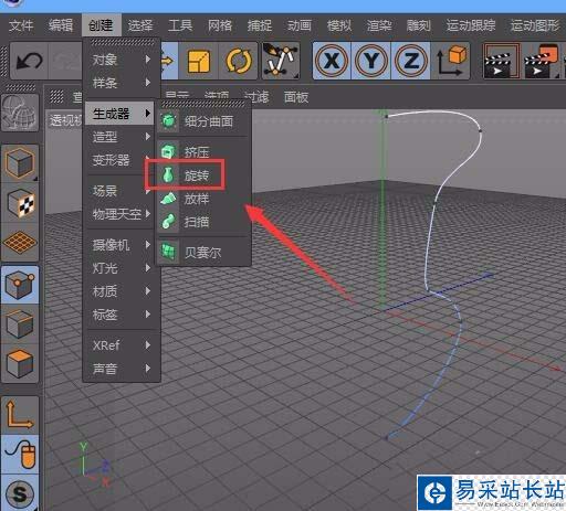 5、繪制好貝塞爾樣條線之后我們在菜單里找到創建選項,點擊該選項在其子級菜單里找到生成器選項,如圖所示: