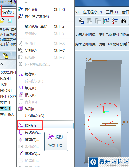 3、選擇草繪的曲線,依次點擊“編輯”-“投影”。