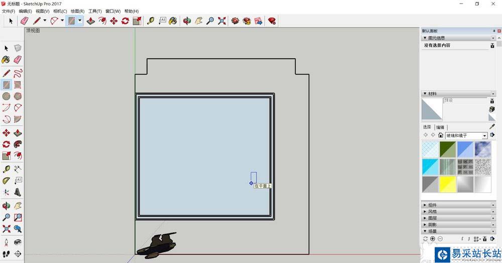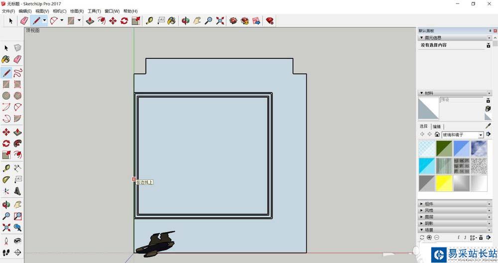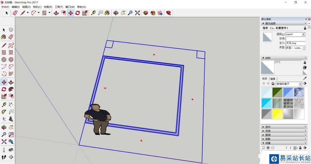 4、導入的文件會自動成為一個組,選擇直線或者矩形工具,圍著吊頂邊線和線條邊線描線,線條部分只描外部邊框即可,后面會教大家怎么貼線條。