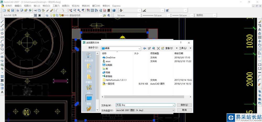2、將紅色圖框中的吊頂邊框和線條選中,W(建外部塊),回車,在彈出的對話框中命名“天花”,保存在桌面上,單擊“保存”、“確定”,即相當于新建了一個獨立的文件。