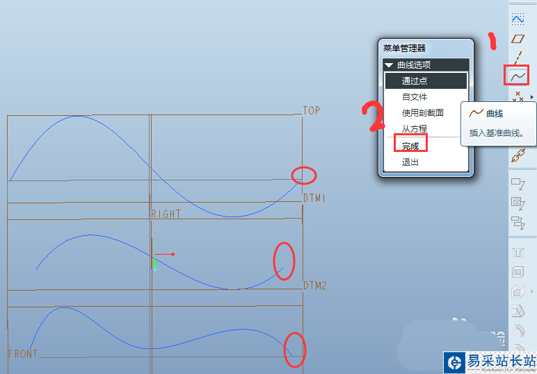5、點擊工具欄的“基準曲線”按鈕,選擇三條草繪曲線的端點創建基準曲線。