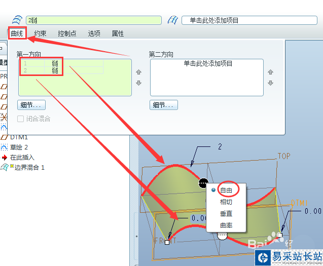 5、系統彈出如下“邊界混合”的操控面板,點擊“曲線”,按Ctrl拾取兩條曲線,點擊“約束”或者右鍵點擊曲線上的圓圈,可對曲面的起始和終端進行約束如自由、相切、曲率、垂直等,我們選取默認值自由,其它幾種形式大家可以自行嘗試。預覽效果如下,點擊√完成。
