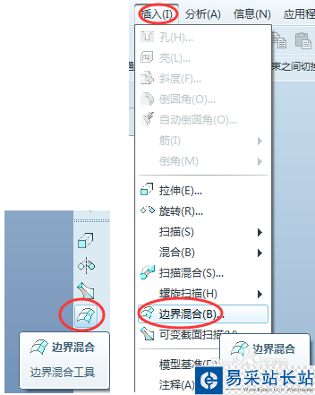4、點擊工具欄里的“邊界混合”按鈕(下圖左),或者依次點擊“插入”-“邊界混合”(下圖右)。