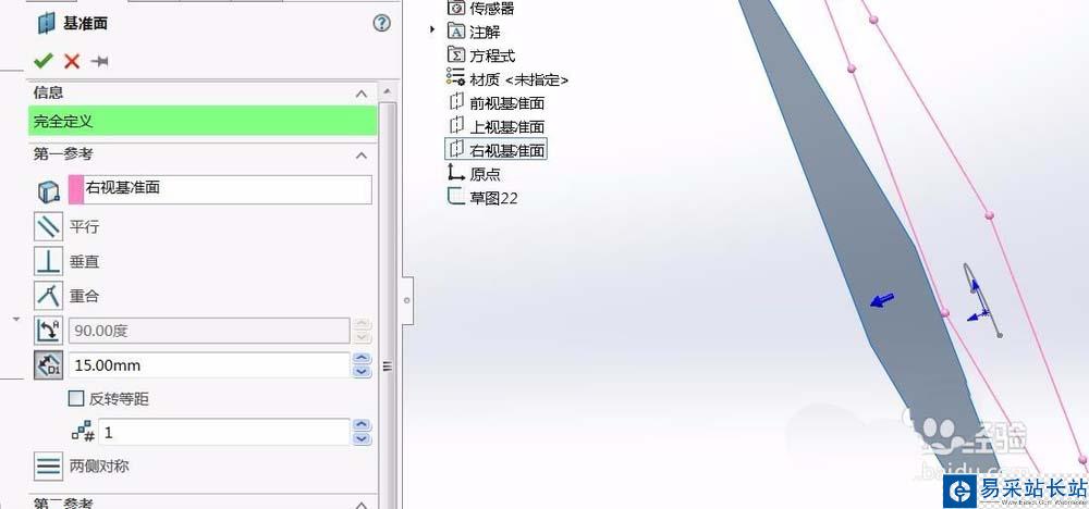2、新建一個基準面,和上一個草圖所在平面平行,距離根據實際需求進行設置