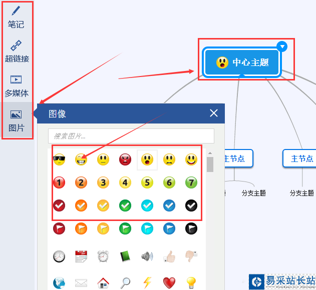 3、左邊的工具欄可以為你的節點添加表情圖片等