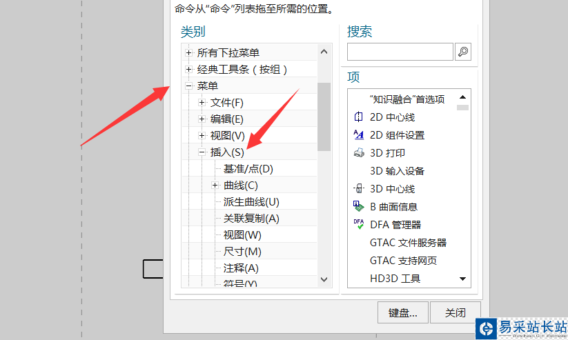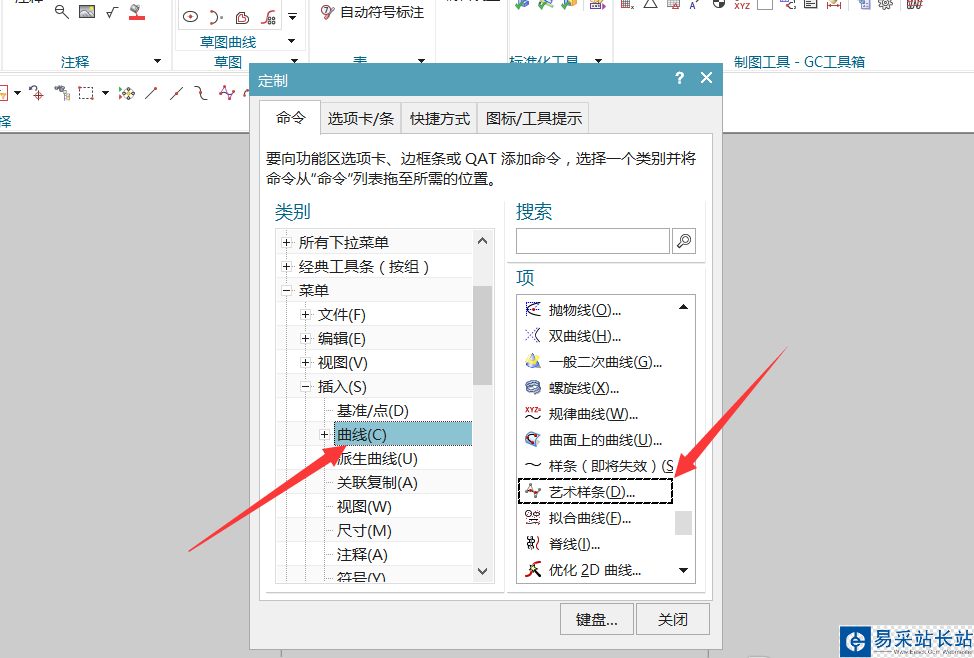 6、在插入里面找到曲線,曲線里面找到藝術樣條,然后拖住藝術樣條拖到上面的命令欄里面。