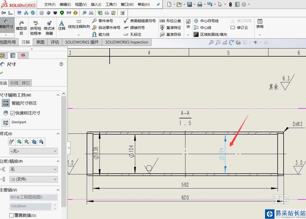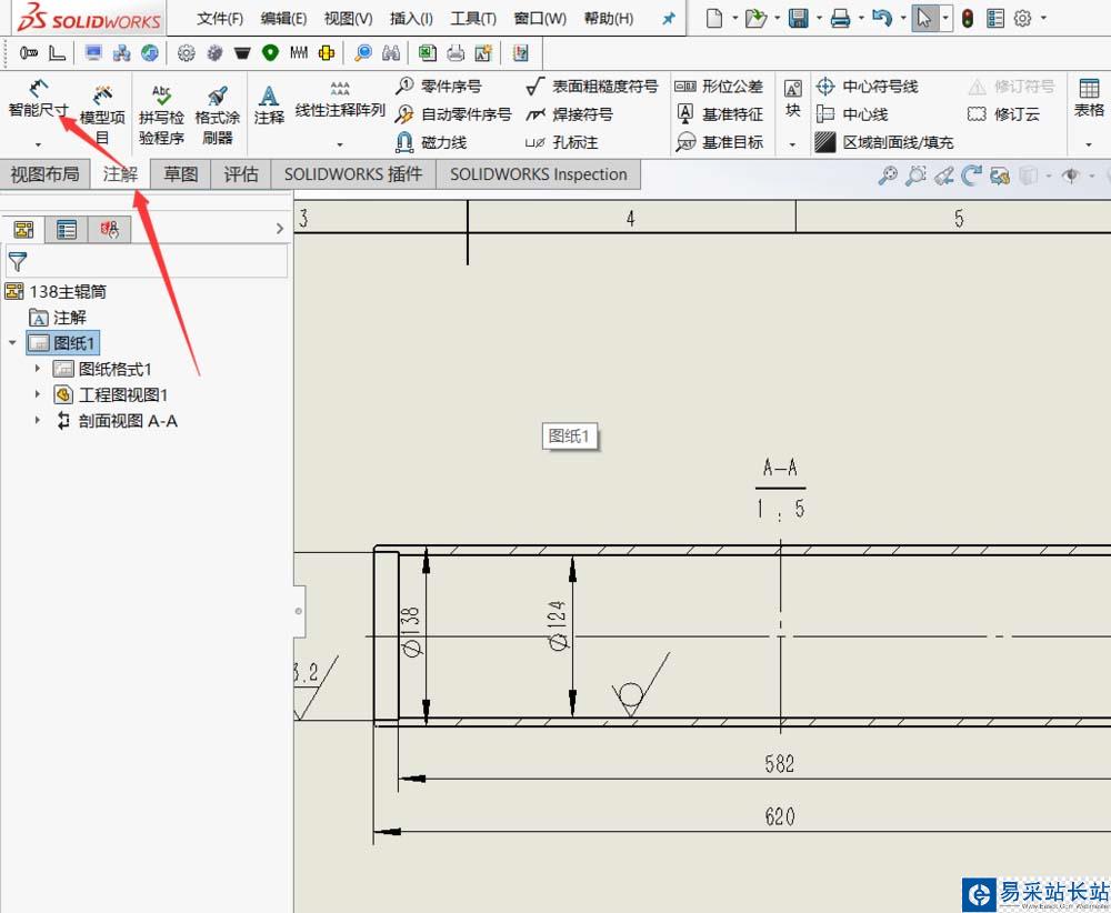 1、我們先進入Solidworks的工程圖里面,然后選擇注解下來的智能尺寸。