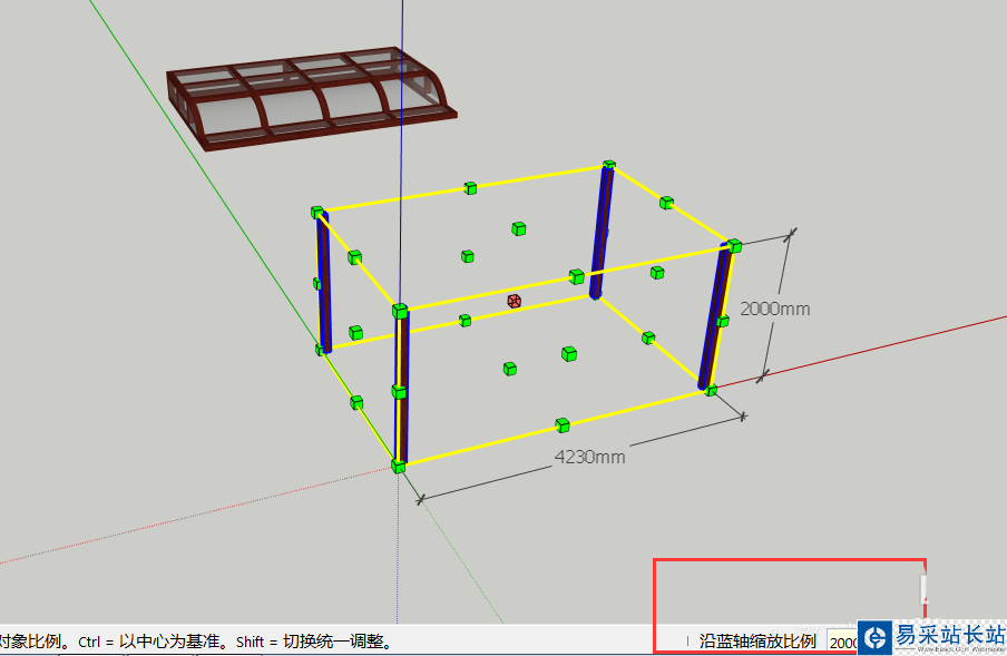3、選擇四根立柱,然后選擇縮放工具,這時四根立柱就像一個整體,出現九個控制點,我們用縮放工具選擇正中間的一個控制點。然后往上拉伸一點點,松開鼠標在右下角的數值框輸入2000mm,按鍵盤上的回車鍵,(輸入的數值一定要帶單位,否則圖形會以倍數縮放),此時四根立柱的高度如圖所示,