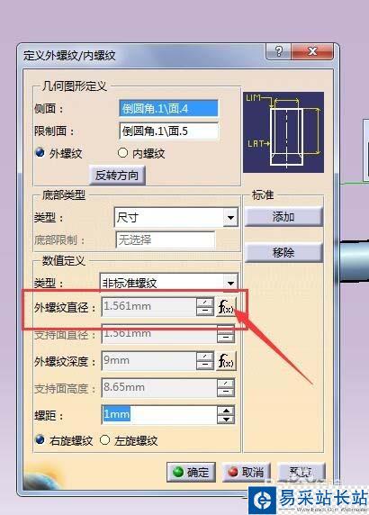 6、然后即相當于新建了一個螺栓零件,但是已經有內容了,接下來研究其實體,如何生成,進行相應修改即可。如這里雙擊箭頭位置,編輯螺紋。