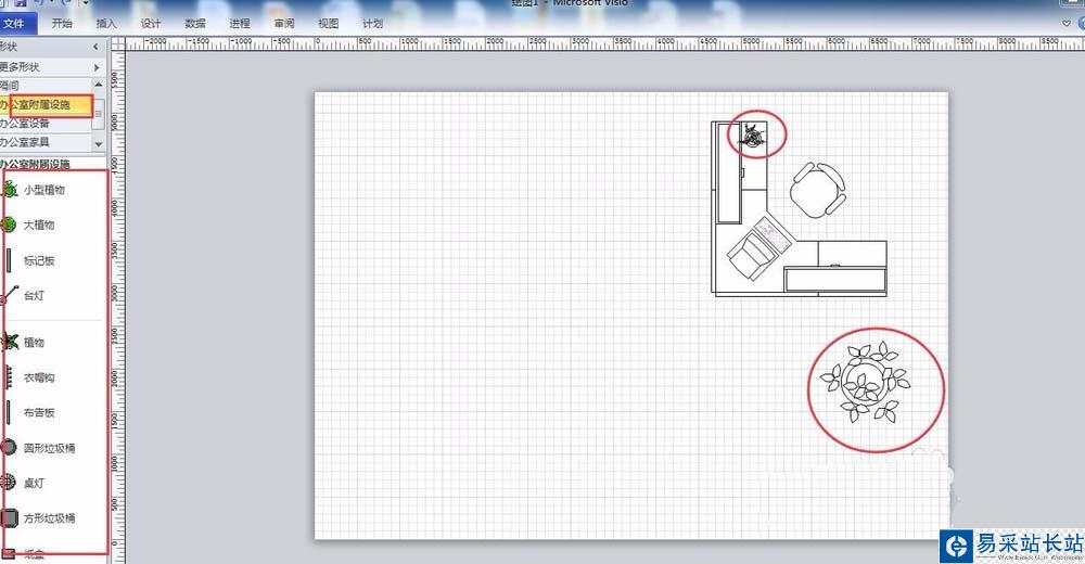 4、如果辦公室有植物、臺燈、垃圾桶等附屬設施,也可以添加至繪圖區域。