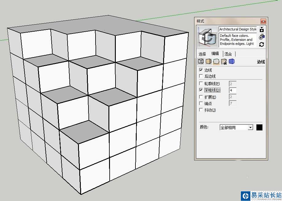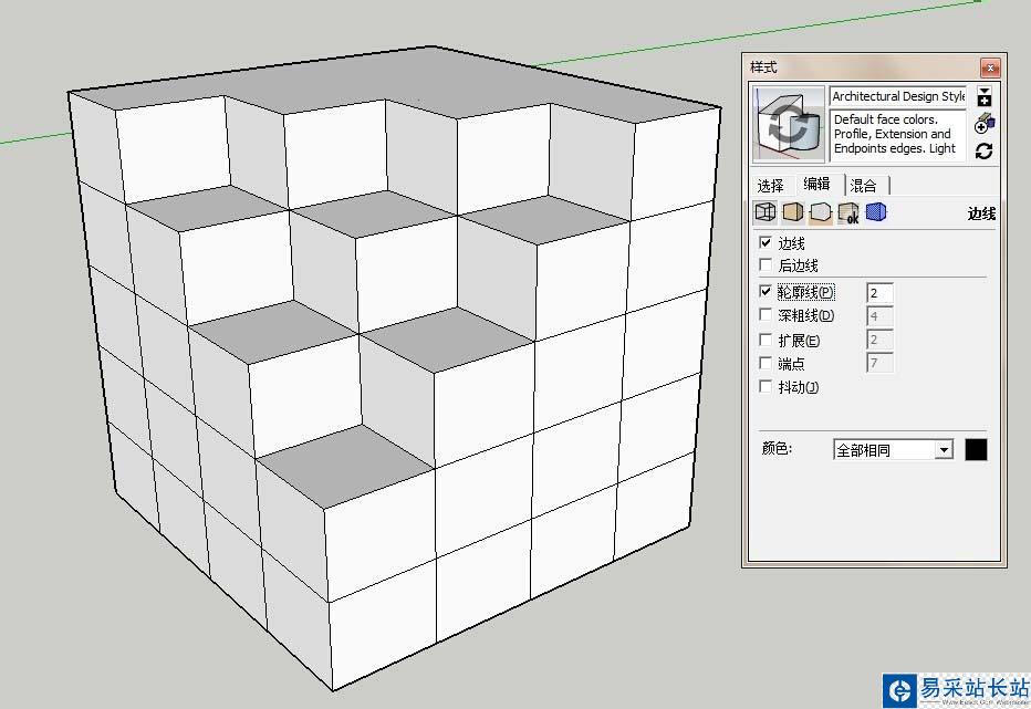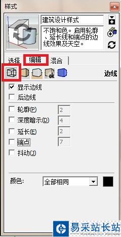1、打開SU程序,然后打開線條樣式編輯器:窗口——樣式——編輯——左起第一個圖標,面板中帶“□”的選項就是需要調(diào)節(jié)的。