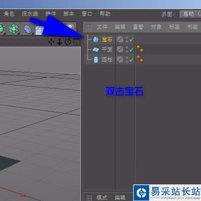 1、比如,創建了一個圓柱體;一個寶石物體和一個地面;創建后,在對象管理器中自動顯示著默認的名稱。