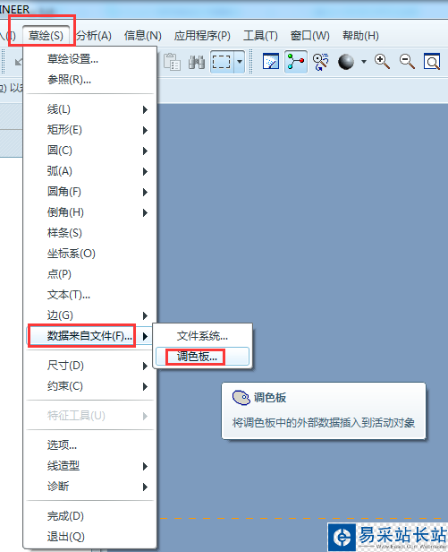 2、進入草繪界面后,依次點擊“草繪”-“數據來自文件”-“調色板”。