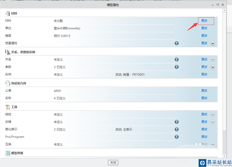 3、在彈出的”模型屬性“對(duì)話框中,單擊”材料“欄右邊的”更改“命令。