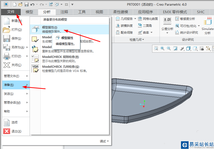 2、單擊“文件”,在彈出的快捷菜單單擊選擇“準(zhǔn)備”,再單擊"模型屬性“。