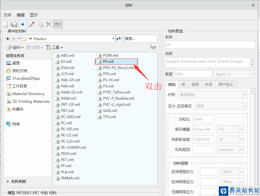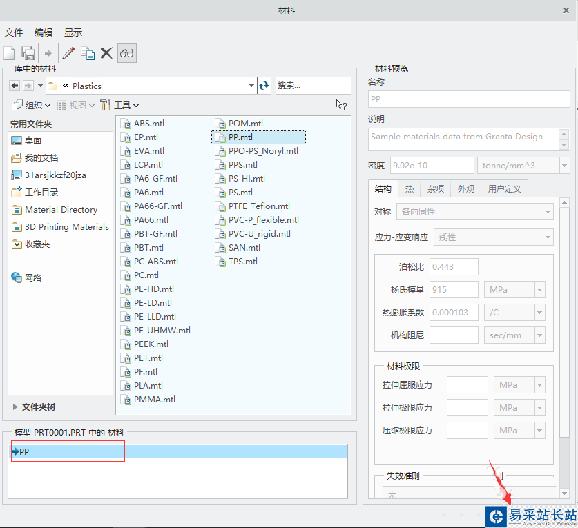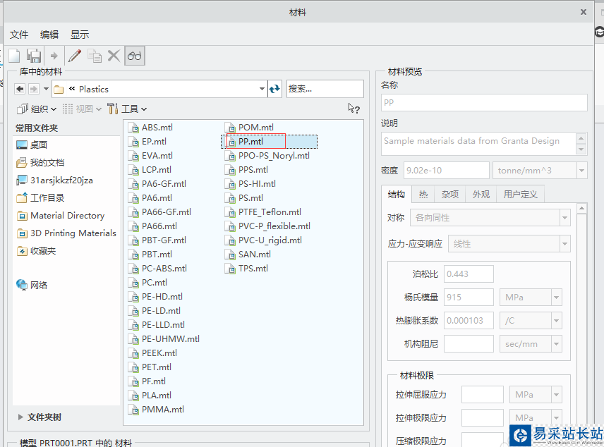 4、在彈出的”材料“對(duì)話框,在材料目錄選擇材料。(比如我選擇PP材料,材料路徑為:Material Directory →Standard-Materials_Granta-Design→Plastics 然后選擇PP.mtl)