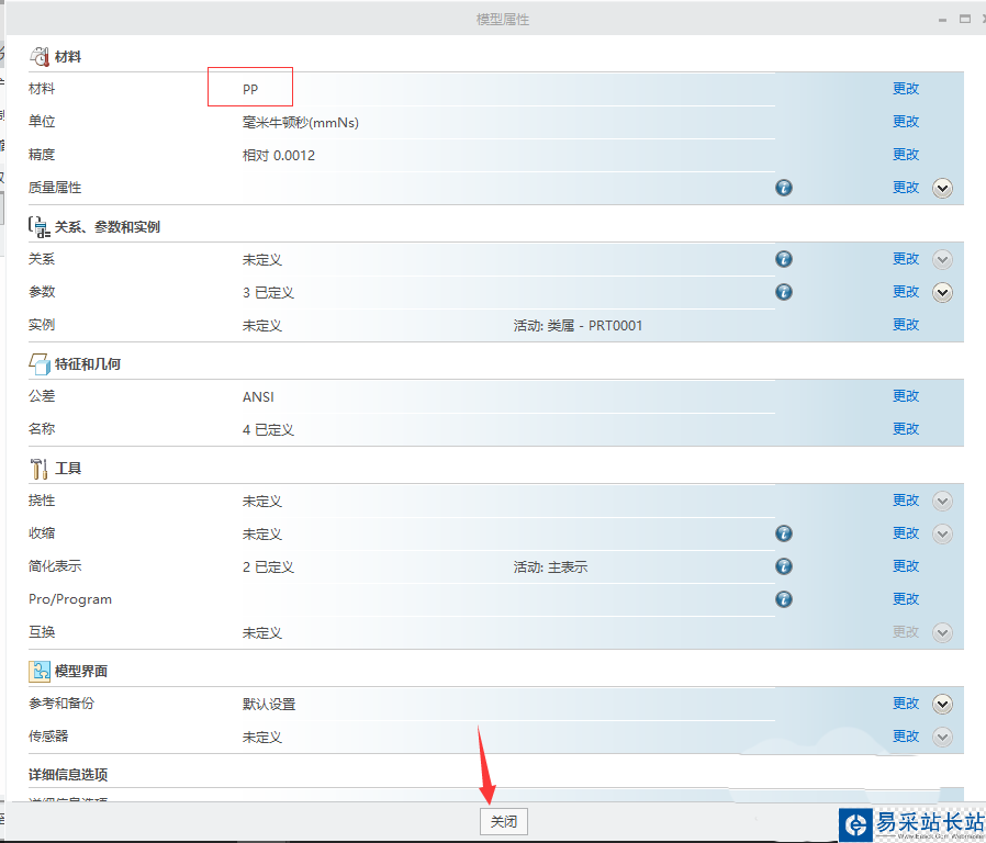 6、回到“模型屬性”對(duì)話框,可以看到材料已經(jīng)被設(shè)置為“PP”。關(guān)閉”模型屬性“對(duì)話框。