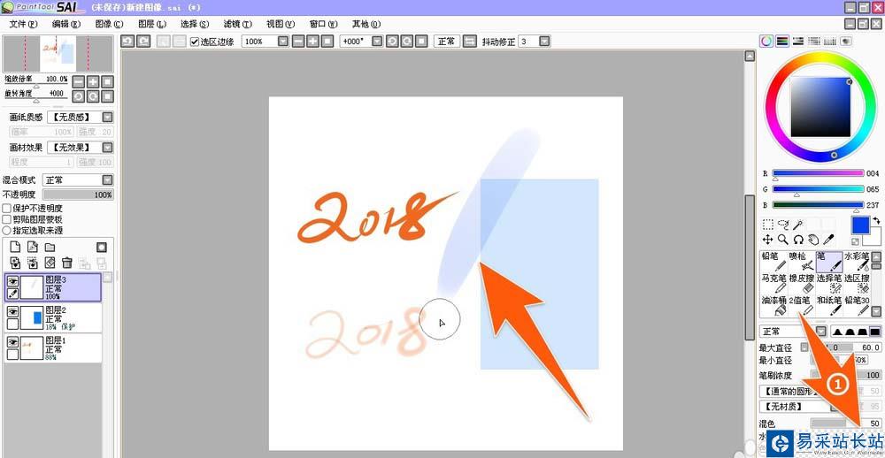 6、另外,如果用的是不彩畫筆,要調整畫圖時的圖像透明度,那么就可以通過拉動那個灰色條,增加水分量,也能實現圖像透明度調整后的效果。