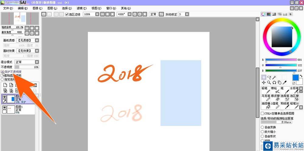 5、如果要設置sai的保護不透明度,那么直接選中該圖層,然后點擊上方的那個保護不透度前的那個框,把此項勾選中就可以了。