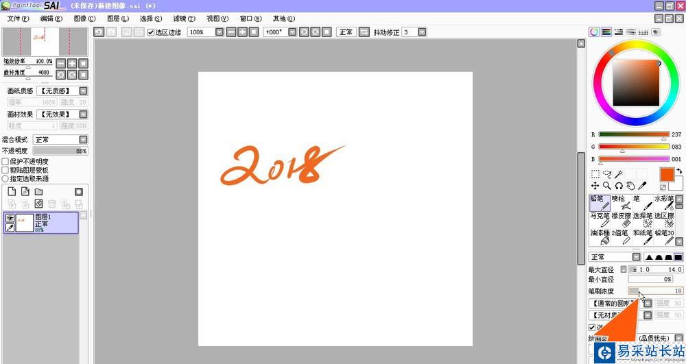 2、這時,為了要增加畫出圖像的透明度,那么可以在面板的下方有一個筆刷的濃度,在后面有一個灰色的拉條,用鼠標左右拉動這個灰色條,就可以控制畫筆畫出后的透明度了。