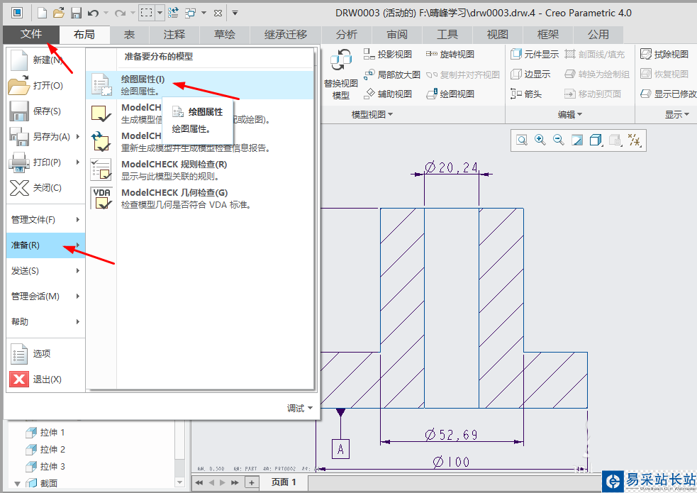 2、單擊“文件”,在彈出的選項單擊“準備”,再在彈出的選項單擊“繪圖屬性”。