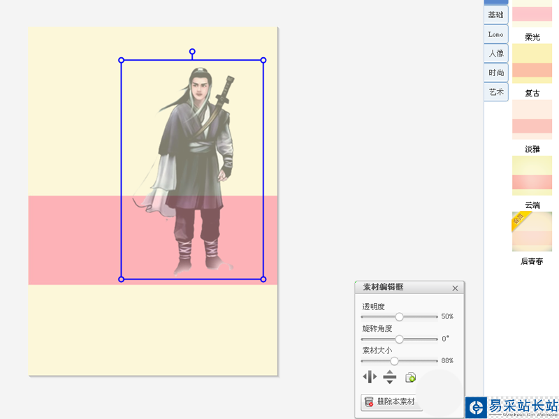 4、右鍵單擊選擇插入一張圖片,將事先準備好的素材圖片導入,調整大小,并設置透明度為50,素材大小為88%。