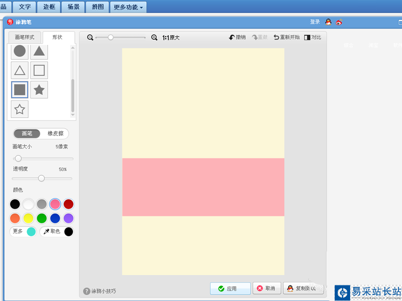 3、選擇涂鴉筆,設置形狀為長方形,顏色為灰色,透明度為50%,在畫布上拖拽一個矩形,點擊應用。