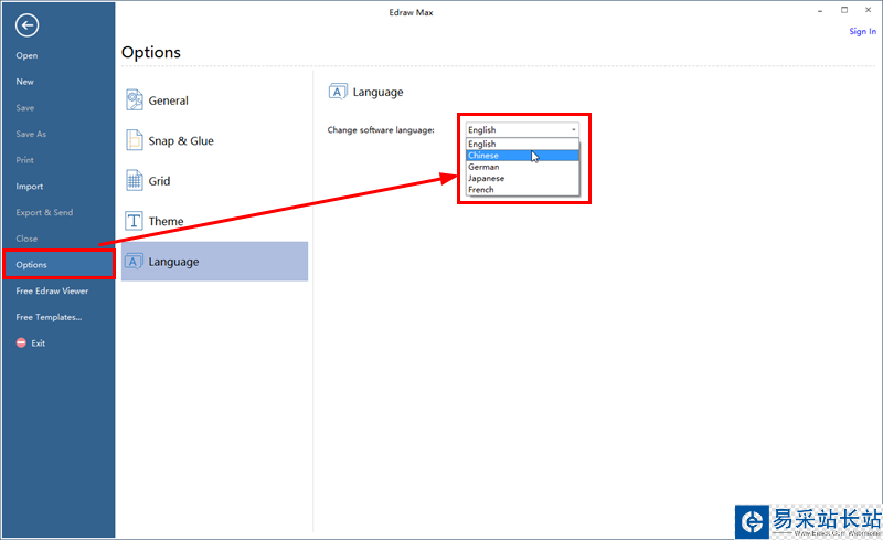 億圖圖示更新之后怎么是英文界面?如何換成中文的?億圖圖示,即億圖圖示專家(EDraw Max),是一款基于矢量的繪圖工具。億圖圖示軟件從V9.1版本,是多語言版本,增加了語言切換功能,可以在軟件中直接將界面切換成簡體中文、英語、日語、法語、德語這五種語言。那么,億圖圖示軟件如何切換界面語言呢?接下來就跟著小編一起去看看詳細的操作方法!