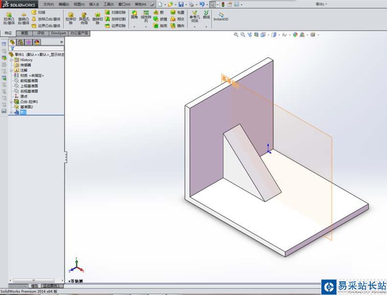 1、打開SolidWorks軟件,新建一個零件文件,并用“拉伸凸臺/基體”命令造一個90°的實體,作為演示所用,實體形狀如下第二幅圖所示。