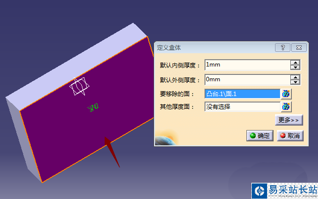 7、選擇要移除的面,被選擇的面呈現紫色,之后點擊確定完成盒體的抽殼操作