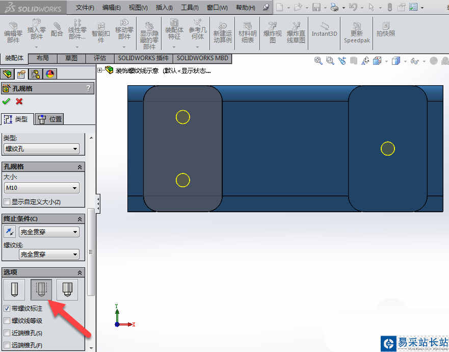 在出solidWorks裝配體的工程圖過(guò)程中,常常會(huì)出現(xiàn)螺紋孔的裝飾螺紋線(xiàn)無(wú)法顯示的情況,特別是當(dāng)此螺紋孔特征是在裝配體中生成的時(shí)候(如下圖所示),該怎么解決這個(gè)問(wèn)題呢?下面我們就來(lái)看看詳細(xì)的教程。