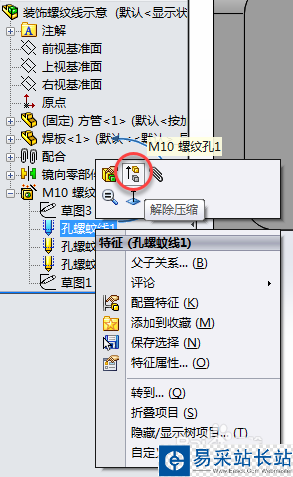 1、出現(xiàn)這個(gè)問(wèn)題時(shí),首先應(yīng)該打開(kāi)裝配體對(duì)應(yīng)的螺紋孔特征,確保孔規(guī)格里選項(xiàng)一欄的“裝飾螺紋線(xiàn)”被選中,另外還要確認(rèn)特征下面的裝飾螺紋線(xiàn)特征沒(méi)有被壓縮,如果被壓縮了的話(huà)需要點(diǎn)擊右鍵將其解除壓縮。