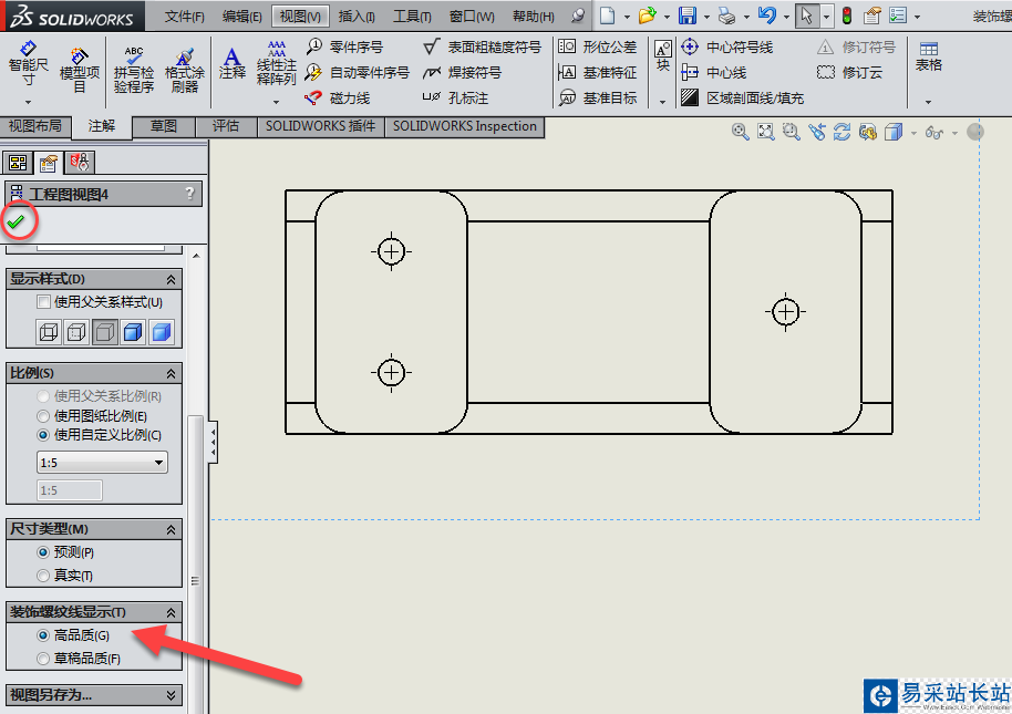 2、切換到工程圖界面,點(diǎn)擊需要顯示裝飾螺紋線(xiàn)的視圖,在左側(cè)的選項(xiàng)卡“裝飾螺紋線(xiàn)顯示”這一欄中選擇“高品質(zhì)(G)”,打鉤確定后裝飾螺紋線(xiàn)有時(shí)會(huì)出現(xiàn),問(wèn)題就解決了,如果沒(méi)有出現(xiàn)的話(huà)需要進(jìn)行下一步操作。