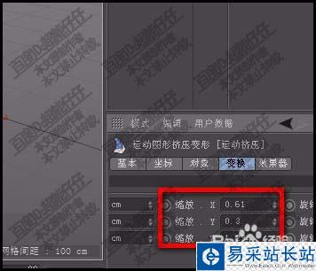 5、再看運動擠壓屬性面板。點開變換的屬性選項。在其縮放這一組中設置其參數。